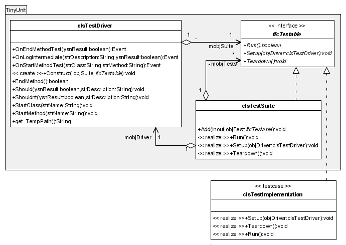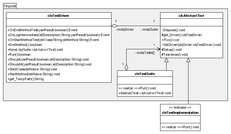 TinyUnit consists of only three elements: a testdriver that starts the tests and gathers the results, a testclass, and a testsuite, which is nothing more than a kind of collection. The testclass is not a concrete class: you derive your own testclasses from it.