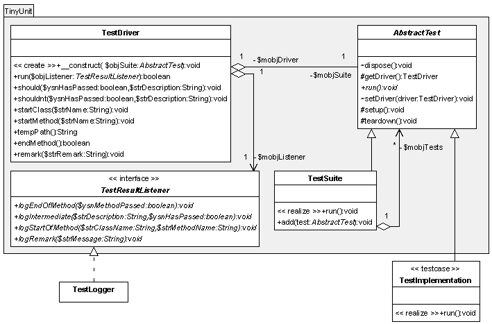 In PHP5, Microsoft-style events are not available and java-style events must be used. This adds one listener interface to the model. Your unit tests will probably be run from some sort of logger class that instantiates the TestDriver and the TestSuite. It is called TestLogger in this model. The vivibility is shown as the first character in a property or method: "+" denotes a public method, "-" a private property, "#" means protected and "~" denotes friend. Note that PHP5 does not support friend visibility, so these methods are implemented as public as well. They are shown in the diagram as friend methods to express their meaning.